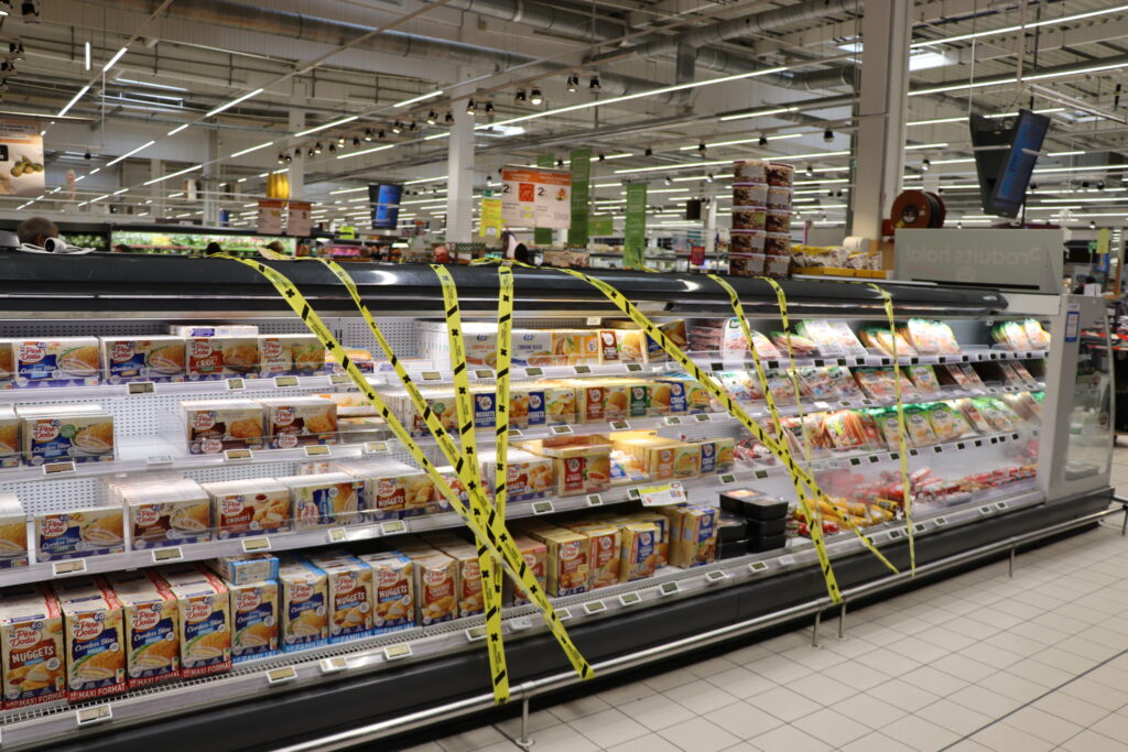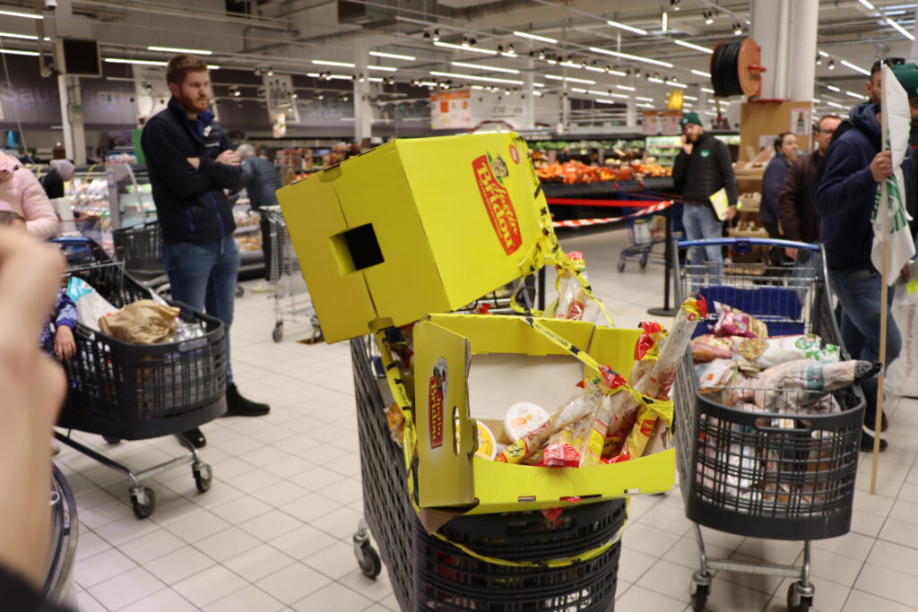 Pendant plus d’une heure, la trentaine d’agriculteurs, par petits groupes, ont inspecté les rayons pour vérifier la provenance des produits. Les denrées importées, ne répondant pas aux normes de production françaises, ont été signalées par une étiquette jaune fluo apposée sur leur emballage.