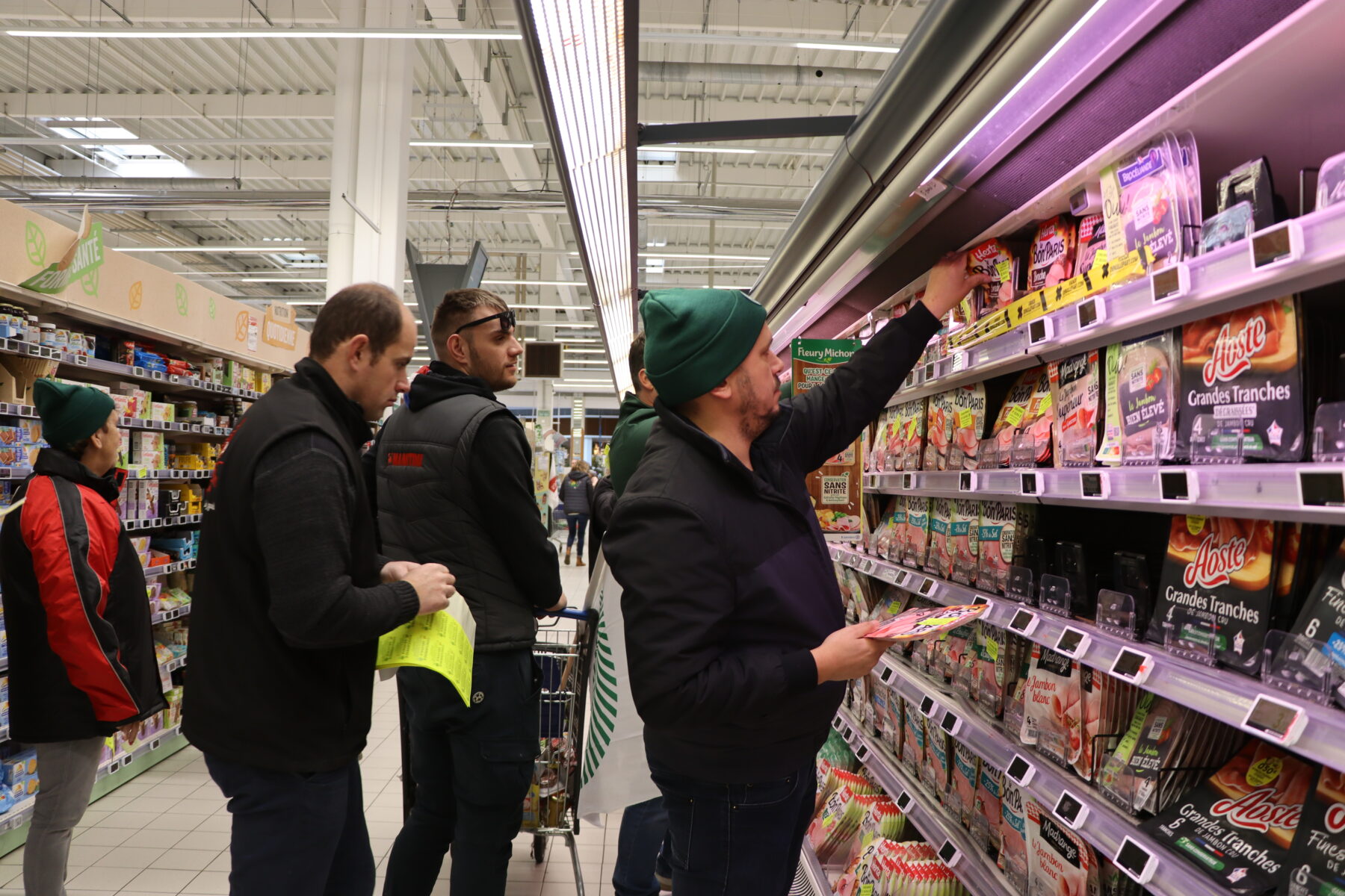Pendant plus d’une heure, la trentaine d’agriculteurs, par petits groupes, ont inspecté les rayons pour vérifier la provenance des produits. Les denrées importées, ne répondant pas aux normes de production françaises, ont été signalées par une étiquette jaune fluo apposée sur leur emballage.